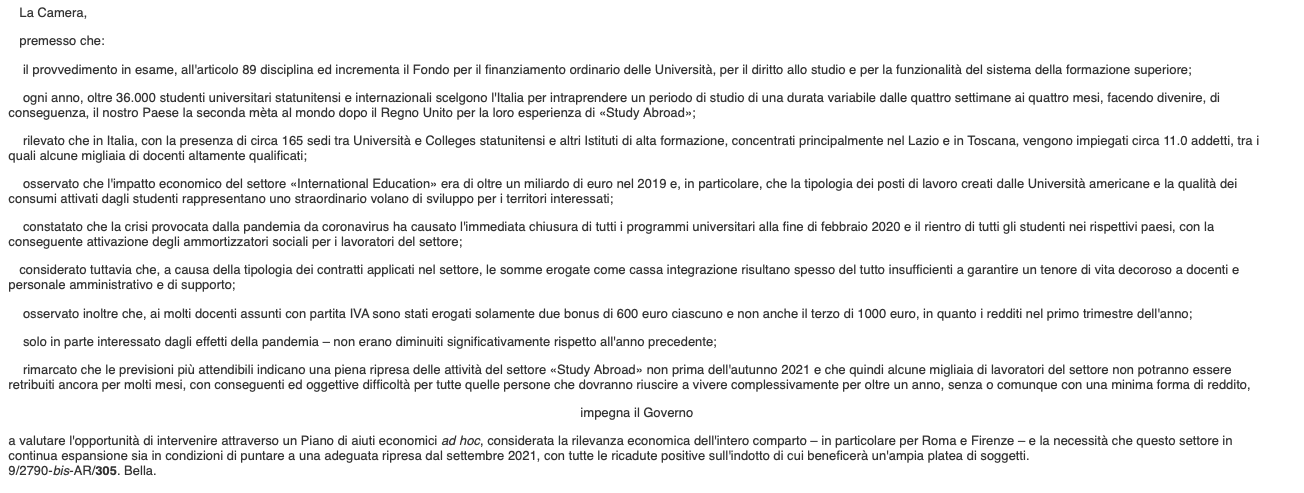 OdG Camera dei Deputati, On. Bella: Piano aiuti economici ad hoc università americane in Italia. La Camera approva.