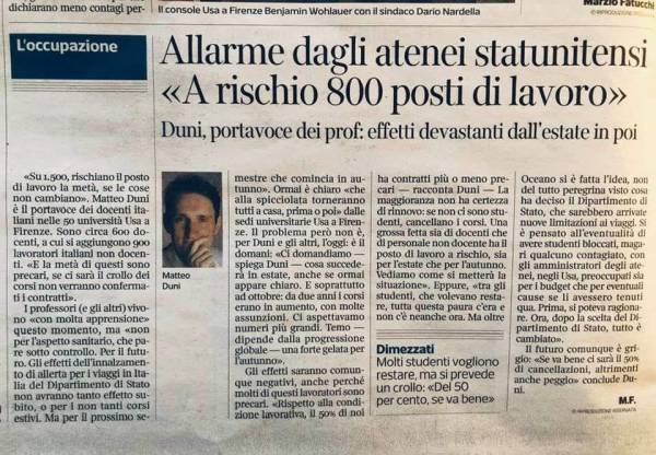 Matteo Duni, Presidente dell’Associazione dei docenti delle università americane in Italia, sul pesante impatto che la disinformazione relativa al coronavirus ha sui docenti e sull’enorme indotto che intorno alle università gravita. ASAUI chiede l’intervento delle istituzioni perché – tutelando la salute pubblica – contribuiscano a ristabilire un clima sereno e responsabile.